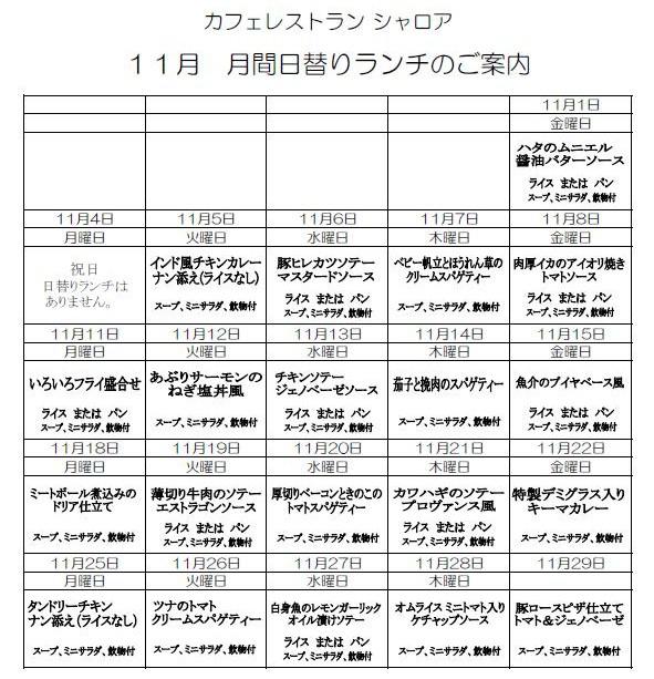 シャロアの日替わりランチの11月の予定表が