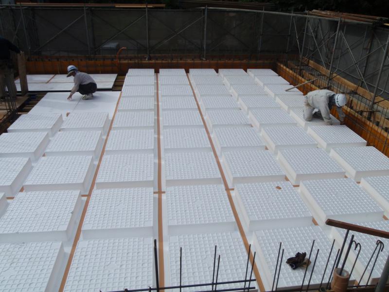 2階床(スラブ)の型枠兼用断熱材敷き込み作業の写真です。