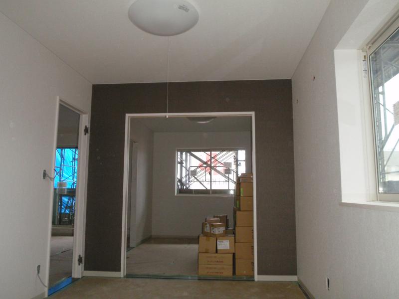 内部は1階よりクロス貼り仕上げ中です。