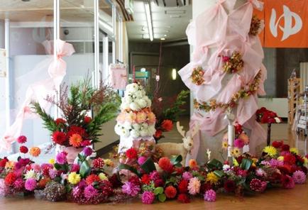 かわにし特産品フェアが行われ、川西のうまいものがずらりと並び、そして、ダリアの切り花1500本を使った「フラワーアレンジ」の展示が行われました。