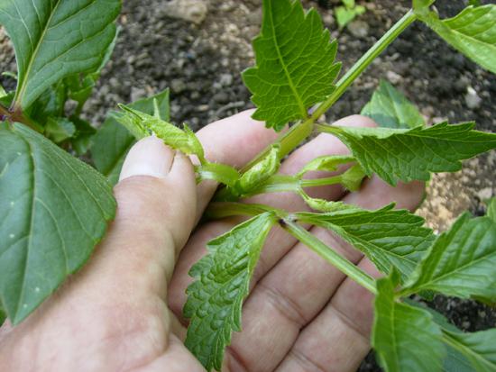 摘心の作業に入ります。繊細な作業になりますので、素手でするのが最適かと思います。(作業を続けると指先がダリアのきけでまっ黒くなりますが)