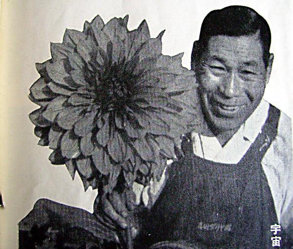 昭和30年秋、九州中西氏の種子による実生中に突然老眼に強く訴える真っ赤な巨大花が開花しました。私事30数年ダリアに情熱を注ぎ込んで以来、その時ほど感動したことがありません。驚喜でもなければ誇りでもなく30年の来しかたを振り返って見た、哀歓の情でありました。翌年もう一度確かめた私は、32年春世界ダリア会の桧舞台たるADS(アメリカダリア協会)ダリア試験場に日本のダリア界の面目にかけ、「宇宙」の球根を送りその真価を問うた訳です。