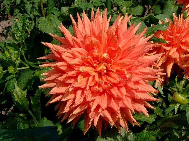 花径:巨大輪(28p前後)、花型:SC(セミカクタス)、花色:オレンジに僅かピンク混じる、草丈:中高生(140p前後)