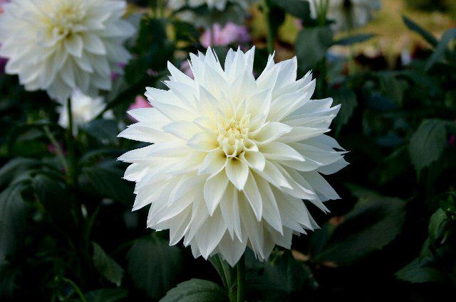 花径:中輪(17p程度)、花型:FDーL(フォーマルデコラ咲で弁咲裂ける)、しかし、カタログデータではSTC(ストレートカクタス咲)となっている、花色:白色中心クリーム、草丈:中性(100p程度)、作出者:鷲沢氏(秋田)