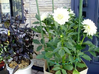 純白の中輪種「ダイアモンドダスト」と黒葉のシングル咲き品種「ミッドナイトムーン」。前者は摘心し枝を6本伸ばして(作り)、脇芽を摘み取りながら順次開花させます。また、シングル咲きの鉢植えは脇芽を放任し、生まれる蕾を次々に咲かせることとしています。