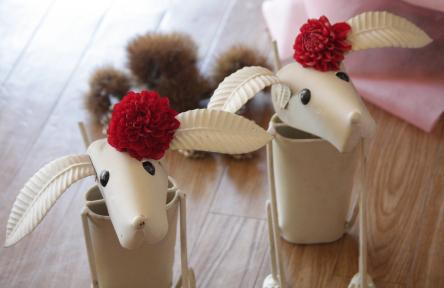 そんな中、一つの作品に私は心を奪われてしまいました。それは、小輪の赤いダリアを頭に付けた2匹のカワイイ犬達でした。(町内の花店「チモシー」さんの作品)