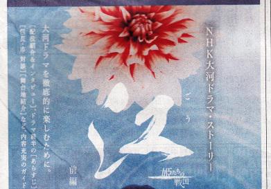 その、ストーリー本の表紙に主役の江姫役の上野樹里ちゃんがブルーをバックに写っていますが、江姫の頭上に「江」の文字、そして、赤に爪白の鮮やかなダリアも写っています。