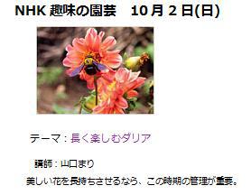 10月2日に放送される「NHK趣味の園芸」の花材は「だりあ」。テーマも「長く楽しむダリア」と題し、講師に日本ダリア会理事の「山口まり」さんが登場します。