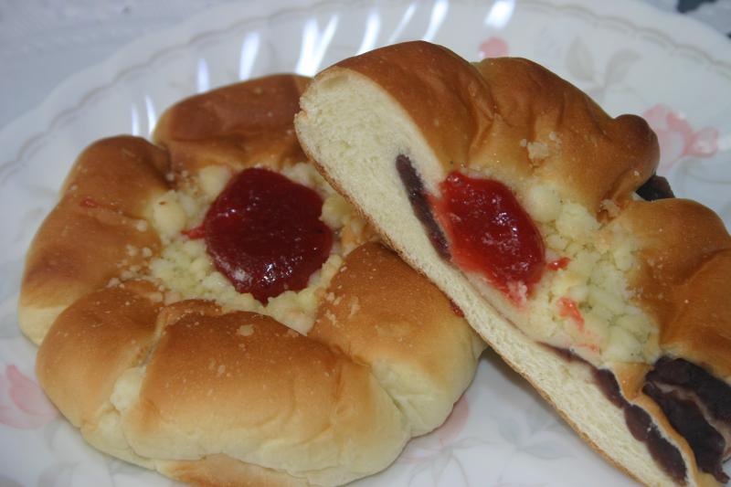 中心にジャムを配置し、その周囲にバターそぼろ、中にはアンコを配した「ダリアパン」が産声を上げた。ジャムの赤はダリアの花心(頭状花)をあらわし、黄色のそぼろと整形したパン生地で花びら(舌状花)を表わした。