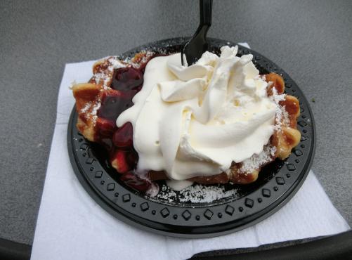 写真は、露店で買った「イチゴシロップタップりのワッフル」 とっても甘かった。