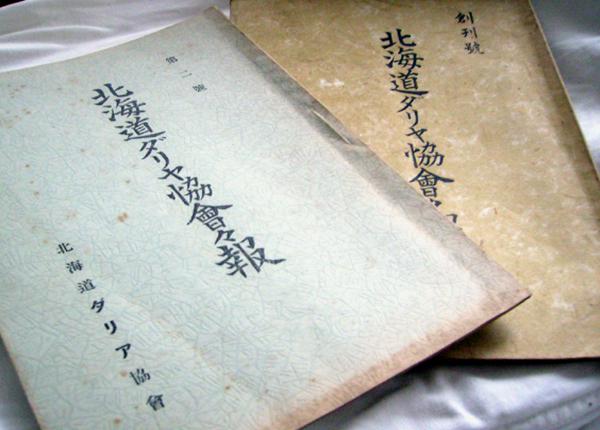 写真は、昭和9年発行の「北海道ダリヤ協会会報・創刊号」と翌年発行の「同・第二号」です。タイトルは「北海道ダリヤ協会会報」であるものの、発行者が「北海道ダリア協会」となっています。当時の混乱を物語っている、非常に珍しい資料である。