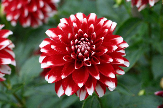 花径:小輪(10p程度)、花型:FD(ホーマルデコラ咲き)、花色:紅色爪白、草丈:中性(100cm程度)