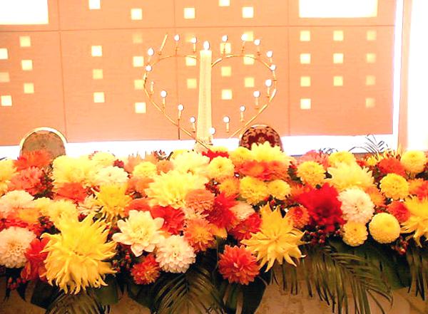会場を訪れると大きな「ウエルカムフラワー」に迎えられ、会場内ではテーブルフラー、メインフラワーがダリアの多彩な彩りに染まりました。
