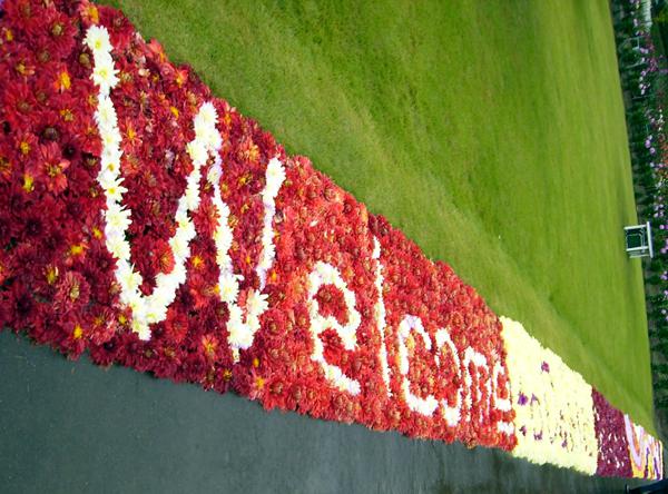 園内の芝生エリアにダリアの花を敷き詰めた「ダリアの絵画」。ダリアの色彩の豊かさがとても目に付く、総延長が約200mの巨大な美しいアートには、なんと、3万個の花が使われていました。(なんと贅沢な使い方でしょう)