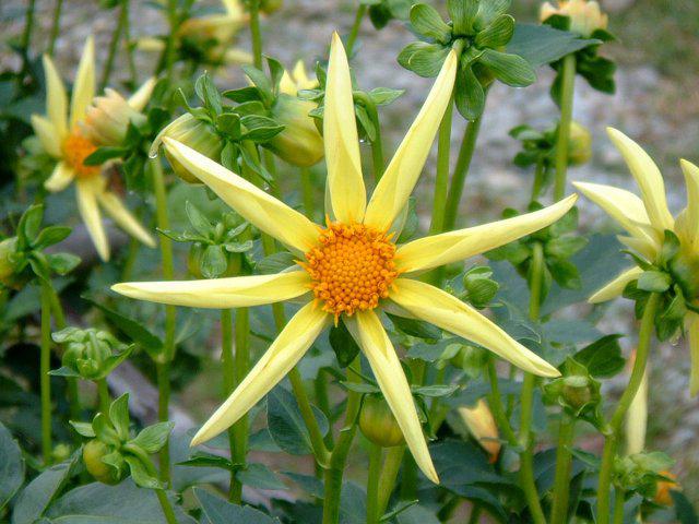 ダリアの代名詞の巨大輪でも、鮮明な深紅でもない。花径は小輪、黄色の変わり咲き品種である。