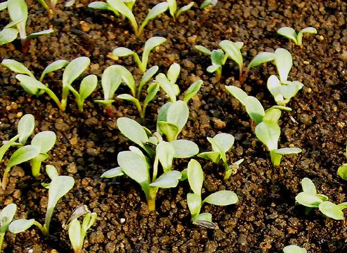 ビニールハウスを使い3月28日に種まきを行いました。ダリアの発芽温度は20度以上となっていますので、無加温のハウスのために夜間の冷え込みによる停滞が心配されましたが、5日ほどで発芽が始まり、写真は10日間の様子です。