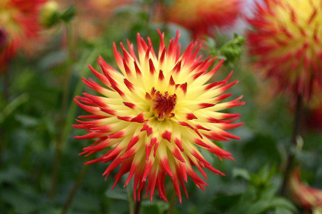 特色:内曲する鋭く細いカクタス咲、純黄の弁先に鮮明な紅色が冴え渡る。花径はダリアにあってやや小振りであるが強烈な色彩であり、その存在感は他を寄せ付けない。品評会、花壇栽培、切り花と使途は多彩である。