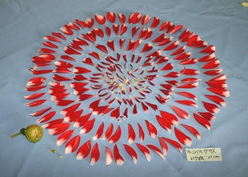さて、ダリアの花びら(花弁)は何枚でしょうか。学校でダリア教室を行うと子供達から質問されることがあります。「30枚、いや50枚、それとも100枚・・・」答えることが出来ません。そこで秋晴れの本日、八重咲き品種の花びらを数えてみました。(※シングル<一重>咲き品種は、殆どが8枚です)