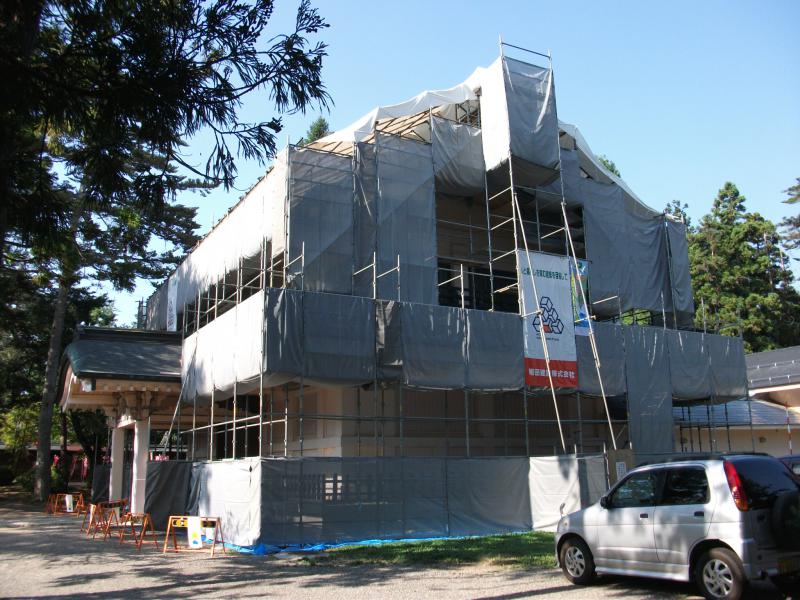 稽照殿の屋根修繕工事が始まり、外部足場と仮設屋根の組立が完了しました。工事は、これから本格的に始まります。