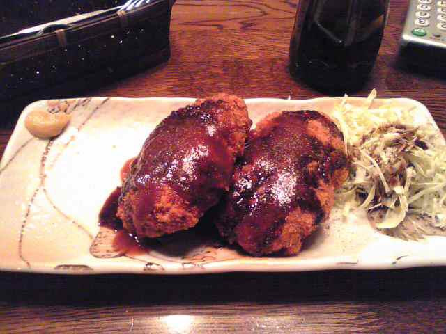 メンチカツです。うちのカミさんは、この手の料理が得意で、いつも「これは旨い!、きっと売れると思うよ」と言っていただきます。でも、原価が高くついて商売にはならないかな・・・?