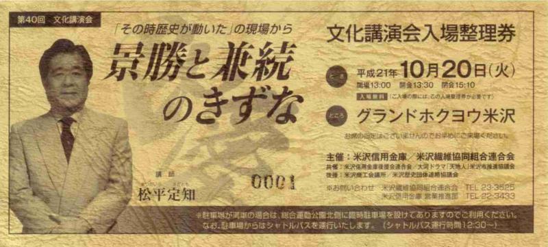 ちょっと時間が経ってしまいましたが、去る10月20日、米沢市のグランドホクヨウ米沢で、米沢織物協同組合連合会さんと米沢信用金庫さんの共催で、以前NHKで放映されていた長寿番組「その時歴史は動いた」の司会をお務めになっていた「松平定知氏」の講演会が催されました。テーマはやはり「直江兼続」。