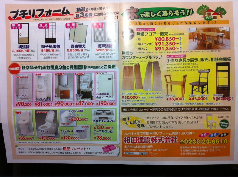 7/17のお知らせその2です。チラシの裏側も御覧ください。このチラシに載っていないものも展示していますよ(それは、来てのお楽しみ・・・ではなく、この暑いさなかではありますが、屋根の融雪の提案です・・・一度ご覧くださいね)