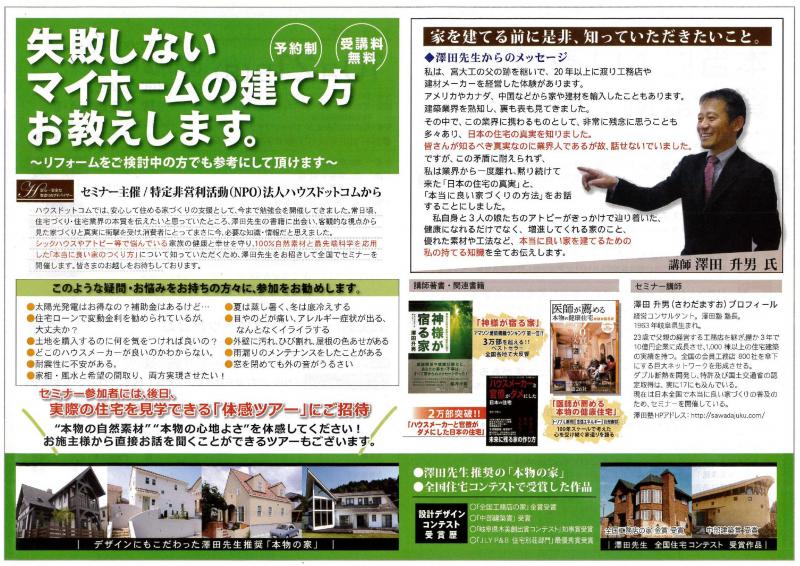 「あの」住宅業界のカリスマ、澤田升男氏による無料住宅セミナー、ハウスドットコム様主催での開催です。