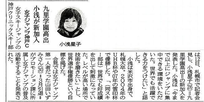 女子スキーのジャンプ競技で活躍しています、本校を平成12年に卒業しました小浅星子さんの記事が「山形新聞朝刊」(平成21年6月13日)に掲載されていましたので、山形新聞社の提供により転載しました。
