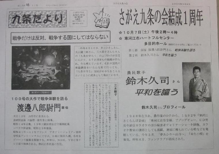 「さがえ九条の会」は、‘ストップザ憲法改悪’を合言葉に、市民の草の根運動として、昨年秋に結成されました。来る10月7日、結成1周年を記念し、さらに運動の輪を広げていくために「農民歌手鈴木久司 平和を謳う」と題して、歌と戦争体験の講演会を催します。