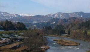 五百川峡谷ビューポイント。「リンゴ畑に囲まれた校庭を進んだ眼下に、大きく曲がりうねった最上川を挑める。翠碧の川面は四季折々に美しい表情を見せる」
