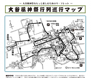 風神祭を網羅した巡行マップと見所を作りました!これがあれば、駐車場・トイレはもちろん見逃した屋台を次にどこで見られるか、串花のもらい方、神輿の参拝方法、行列の役割や意味までを知ることができます。ぜひこのリーフレットをポケットにお出かけ下さい。 ↑上記ダウンロードボタンよりpdfファイルを開けます。 ※大谷のみなさんのお話をもとに作られた朝日町エコミュージアムの小径第15集『大谷風神祭』から抜粋し作りました。 〔屋台と代々神楽(大獅子)について〕 代々神楽(大獅子)は各区の当番制となっていますので、当番となった区では屋台は出さないことが多いです。26年は立小路(第一区)が当番となっていますので屋台は出しません。 →大谷の風神祭 |