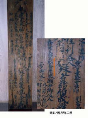 前田沢の国道から50m程入った山際の丘の上に祭られているのが「夜観音」で有名な観音堂です。棟札を見ると享保3年(1718)に再建されたことが分かります。別当成原家は、350〜400年の歴史を誇る旧家であり、先祖藤三郎は飛騨の国高山の人で、故あって甲冑、大小刀、笈を背負って当地に来て観音堂を建立したと伝えられています。天井図には狩野派系と推定される雨龍が描かれており、観音信仰と竜神信仰が結びついたものと推定されています。祭礼は8月10日夕方から夜にかけ催されますが、この日参詣すれば四万六千日の参詣のご利益があると伝えられています。昭和の始めまでは夜店が立ちならび、近郷近在より参詣者で賑わったそうです。五百川三十三観音第24番札所(聖観音)朝日町大字宮宿1610-2