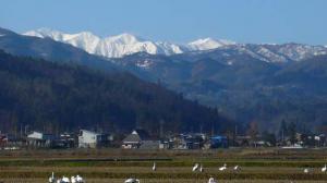 意外なことに大谷地区は朝日連峰を近くに見る事ができる場所です。猿田越峠や日光山の麓にかけてがビューポイントとなっています。また、たくさんの白鳥が餌を探しに大谷の水田を訪れる場所でもあります。3月下旬まで見ることができます。
