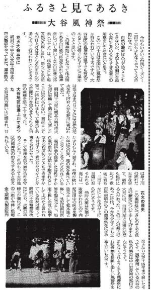 (記事 / 町報あさひ 昭和36年(1961)8月5日号より抜粋) 堀敬太郎さんのお話 昭和三十六年の町報あさひに、花火に関する詳細が出ています。 大谷地区では江戸時代から花火を打ち上げておったといわれておりますが、本当かどうかの確証はありません。しかし、この記事には、江戸時代には火薬の取り扱いは医者が扱っており、白田内記家が白田医者を製造元として「旭連」という連を作ったと。そして白田外記家は、ちょうど今の鈴木床屋辺にあったといわれる浜田医者を製造元として「松本連」をつくって、お互い競い合って花火を打ち上げておったと書いてあるんです。それが明治になり、警察がほとんど火薬を取り扱うようになって、勝手に花火を作ることができなくなり、さあ困ったということで、東の白田藤三郎さん(昭和三十九年に亡くなって、ちょうど今年が五十回忌)を福島に花火師として養成するためにやったと。 そこで勉強して大谷に戻り、松本連、旭連を解消しまして「旭連金玉屋煙火製造販売業」という会社を興して、大正14年まで製造販売もしたと。ちょうど愛宕様に火薬庫があったと昔の人から聞いておりますし、実際製造したことは間違いないと思います。私たち小さい頃はよく花火屋、玉屋って呼んでいました。今も屋号は花火屋ですね。白田八郎さんの小屋に行ってよく花火の殻なんかも見たことがあるので、製造したことは間違いないと思うのです。それが大正十四年まで続いたというふうに書いてあります。 そして明治四十三年に東北の花火大会に白田藤三郎さんが出場して、第三位になったんだそうです。その時の賞品が柱時計なんだけど、残念ながらこれはないそうです。今は孫さんが打ち上げを現在も継続してやっています。 (大谷風神祭シンポジウム・パネルディスカッション 2013.9.25) エコミュージアムの小径第15集『大谷風神祭』より抜粋 上記ダウンロードボタンで記事のPDFファイルが開きます →大谷の花火打ち上げ →大谷の風神祭 →空から人形!?人形傘花火 →小径第15集『大谷風神祭』 |