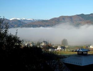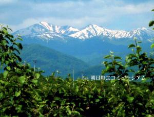 送橋(おくりはし)集落から町道松保線を登った高台に位置するりんご畑の目の前に、大朝日岳から連なる朝日連峰の大パノラマと白倉スキー場を一望することができます。