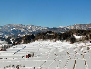 四ノ沢(しのさわ)は、町内で最も大朝日岳を見ることのできる地区です。田園や果樹園などを前景に、集落の至るところでその姿を目にすることができます。