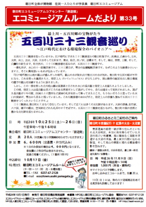 五百川三十三観音巡り 〜江戸時代における環境保全のパイオニア〜 五百川三十三観音を知っていますか。江戸時代にできた三十三観音巡りの朝日町版です。西奥は、白倉から、立木、太郎、水口、北は、大沼、大谷そして左沢まで、東は、和合、四ノ沢、送橋まで、そして、南は、宮宿、上郷、そして、白鷹町の針生まで、町内外の、三十三の観音様を巡るのが、五百川三十三観音です。 一番札所が、水口の十一面観世音です。三十三番目が、雪谷の如意輪観世音です。なぜこのような順番かといいますと、そこに興味深いいわれが伝わっています。 『江戸時代朝日山地の鉱山が盛んだった時代、鉱山の水が流れ出て朝日川の水が汚れ、朝日町や左沢の稲が不作になり、これを怒った農民たちと、待定上人(たいじょうしょうにん)が立ち上がり、閉山勧告の廻状を出し朝日権現の麓での鉱山を封鎖するように訴えました。 しかし、この一揆を怒った庄内松山藩は首謀者と目された水口の長兵衛と待定上人を捕らえようとしました。 この時、待定上人は長兵衛は見どころのある若者だとして逃がしてやり、自らは捕まって処刑されました。逃げた長兵衛が十年の間、四国八十八箇所など諸国の札所を回って帰ってきたところ、もうないだろうと思っていた水口の実家が、雪谷から見ると残っていました。これも観音様のおかげだと、待定上人の供養も兼ねて五百川三十三観音をつくったということです。』 三十三観音は、朝日町にくまなく存在しています。そして近くには多くの文化財があります。大沼の浮島、佐竹家、八ツ沼、椹平の棚田、空気神社どれも札所のすぐそばです。五百川三十三観音を巡りながら、朝日町の秋の自然と豊かな文化財を巡りませんか。 日 時 平成26年10月25日(土)〜26日(日) 午前9時〜午後16時頃 集合場所 朝日町エコミュージアムコアセンター「創遊館」 定 員 20人(※定員になり次第締め切らせていただきます。) 参 加 費 6,600円(交通費・弁当・資料代など実費) ※1日のみ参加の場合は4,000円となります。 参加費にご朱印代は含まれません。 別途ご用意ください。(1箇所100円) 申込締切 10月17日(金) 申込・問合せ先 朝日町エコミュージアムルーム ( 9:00〜17:00 月・木曜休館) ■TEL・FAX 0237-67-2128 →五百川三十三観音縁起 →五百川三十三観音霊場一覧 |