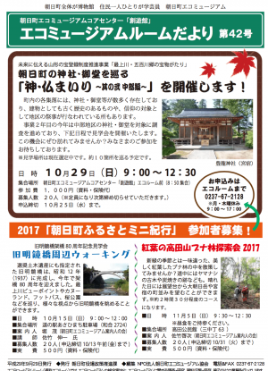「神・仏まいり〜其の壱 西部編〜 参加者募集中! 町内の各集落には、神社や寺院・御堂等が数多く存在しており、なかには最上川舟運との関わりを持つと思われるものもいくつかあります。建物としても古いものもあり、信仰の対象として地区の祭事が行われているところもあります。今年度は西部地区の神社・御堂を対象に下記日程で見学会を開催いたします。この機会にぜひ訪れてみませんか? 日 時 10月23日(日)9:00〜12:30 集合場所 朝日町エコミュージアムコアセンター「創遊館」エコルーム前 8時50分集合 参加 費 1000円(資料・保険代) 募集人数 20人(定員になり次第締め切らせていただきます) 申込締切 10月19日(水) 主 催 NPO法人朝日町エコミュージアム協会 ※写真/大船木の熊野神社 |