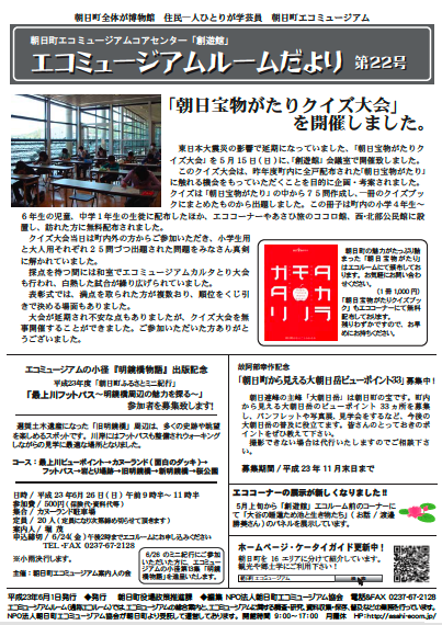 【内容】朝日宝もの語りクイズ大会報告、大朝日岳ビューポイント33の募集、ふるさとミニ紀行お知らせ、エココーナー展示について。