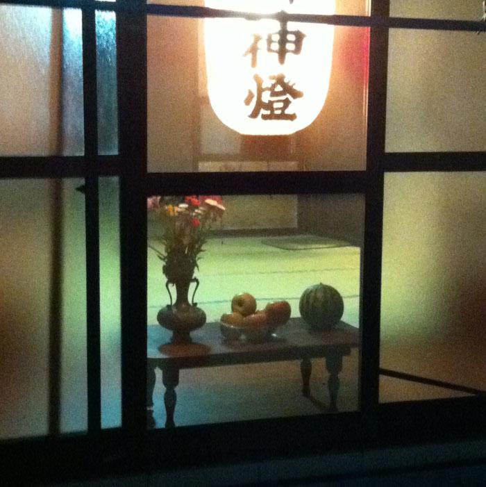 風神祭の御供え物は、縁側に小机置いて、赤飯と季節の物を上げる。たとえばスイカとか夕顔とかブドウとかのあるものだね。それからローソクも立てて、上には提灯を下げる。そして、神輿の神様が来てけるように、その御供えの前まで道路からの盛り砂をつなげるんだ。