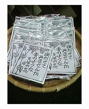 鷹山の里米沢そば街道加盟店で、蕎麦の実を小袋に入れた物をお配りしています。蕎麦は強い植物ですプランタンなどにまくだけで簡単に育ちます是非お試し下さい。