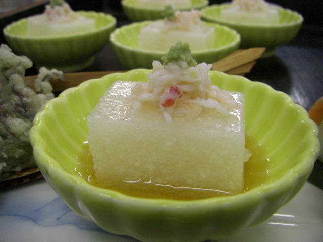 出汁をかけ、蟹と山葵をのせます。