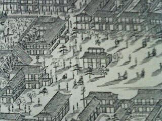 中央に尼湯.左側手前に坂本屋 上に春木屋.