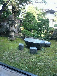 宴会場から中庭を見た景色です。自然の地形をてぼりで作った庭で山菜が自生しています。石のベンチ、テーブルは東京芸大講師の作品です。