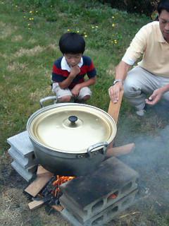 薪に火をつけます。鍋に蒟蒻、里芋を