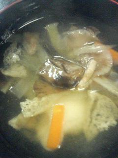 大根、人参、なめこ、油揚げで雑煮をつくり