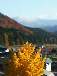 盆地、周辺の山々まで紅葉がおりてきて、小野川、