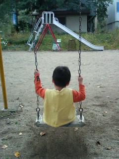 公園になりました。 子供がブランコにのっています。