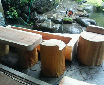 に足湯ができました。丸太細工がよく似合い