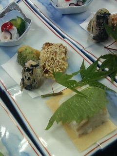 山女寿司。揚げ物、南瓜、海老しんじょう磯辺
